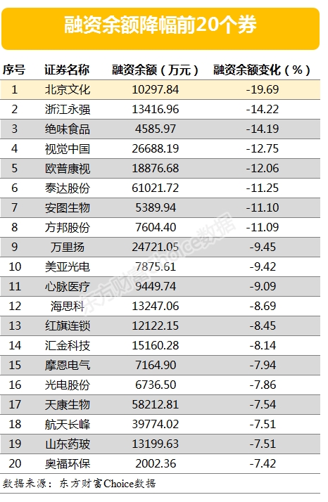 与之形成对比的是,当日有887股融资余额出现下降。其中,融资余额降幅超过3%的有113只。北京文化的融资余额降幅最大,最新融资余额10297.84万元,与前一个交易日相比,融资余额下降了19.69 %。