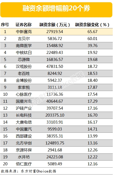 融资余额增幅最大的是中新赛克,该股最新融资余额27919.54万元,较前一交易日增长65.67 %。另外,融资余额增幅较大的还有吉贝尔南微医学等,增幅分别达60.01 %、39.76 %。