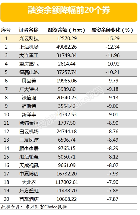 以下为当天融资余额降幅最大的20只个券: