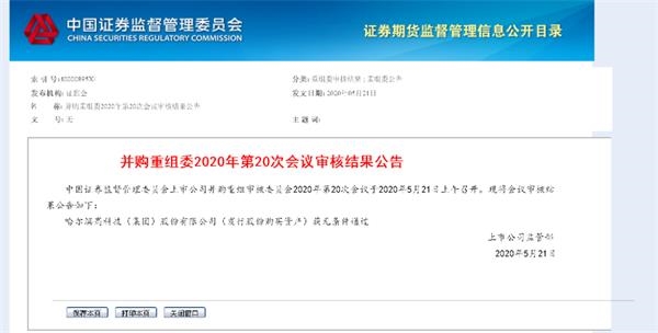 5月21日上午,中国证监会并购重组审核委员会2020年第20次会议召开,哈高科发行股票购买资产并募集配套资金项目获无条件通过,即湘财证券终于成功完成了曲线上市,历时仅不到一年时间。