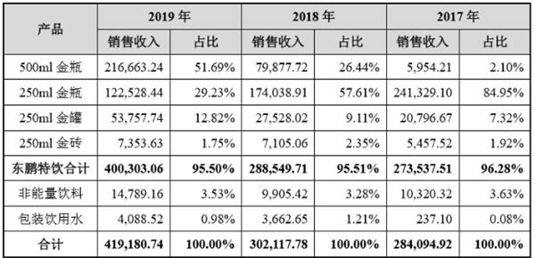 报告期内,东鹏饮料营业收入分别为28.44亿元、30.38亿元和42.09亿元,呈现逐年攀升趋势。其中2018年度和2019年度同比增长6.82%和38.55%。同期,该公司的净利润分别为2.96亿元、2.16亿元和5.71亿元,2018年度同比下降27.03%,出现增收不增利现象。