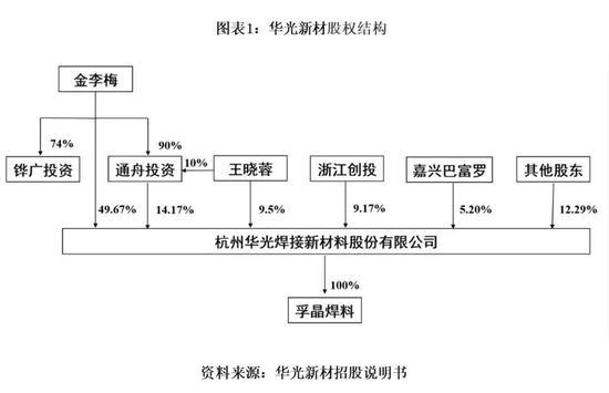 华光新材前身为杭州华光焊接材料有限公司,成立于1997年11月19日。最初设立时,杭州河西实业总公司持股51%,自然人徐清、王德法分别持股48%、1%。截至招股说明书签署日,华光新材控股股东、实际控制人为金李梅。公司股权结构图如下: