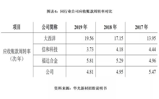 另值得注意的是,与华光新材具有较强可比性的上市公司福达合金(12.170, 0.06, 0.50%)(603045.SH),其采用的原材料为白银和铜,定价模式、原材料采购模式和销售模式也与华光新材大致相似,2017—2019年的应收账款周转率分别为4.96、5.29、5.81。
