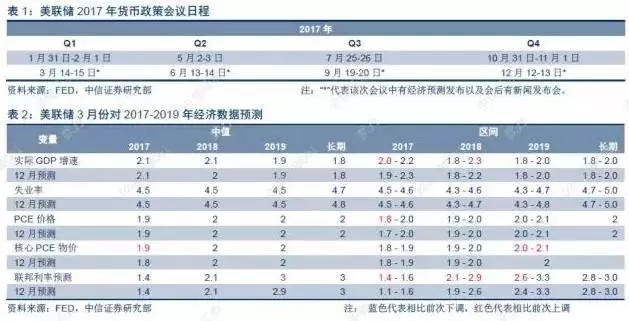 3月会议相比前次会议的变化体现在:①会后声明对通胀的表述相对市场预期更加鸽派,尽管通胀接近2%目标,但仍认为核心通胀低于目标,中期通胀预期稳定;②耶伦讲话表示缩表尚未到来,加息仍将是渐进的,并强调不要过度解读声明中删除的“仅仅”循序渐进加息的措辞变化;③经济预测中没有上调2017-2019年实际GDP增速,仅小幅上调2017年的核心PCE物价0.1个点,今明两年利率路径的预测中值相比此前预测未变;④点阵图反映的年内加息三次的委员由6人增加至9人,但是2017-2019年加权利率预测中值基本未变(分别为1.4%,2.3%和2.7%)。相比市场此前担心美联储会通过上调经济增速、通胀预期来强化未来加息节奏来看,本次会议的措辞变化并没有显著改变美联储未来1-2年的加息节奏预期,一定程度上缓解了市场对美联储加快紧缩的担忧。