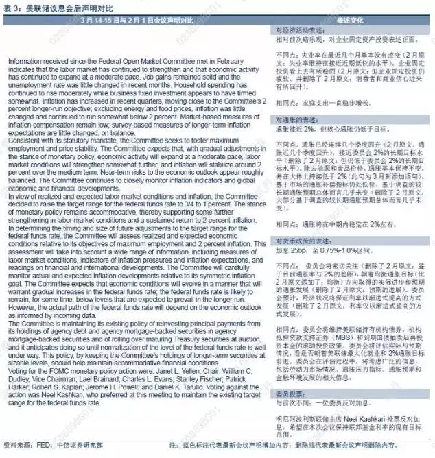 美联储3月会议如期加息25bp,会后声明相对鸽派。美联储3月会议上调基准利率25bp,符合市场一致预期;但无论从点阵图、耶伦讲话来看,相比市场担心的美联储年内加息节奏大幅上调来看,本次会议声明释放的信号相对鸽派。