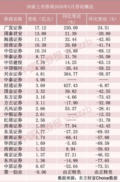 从营收看,除第一创业外,25家上市券商5月份营收均为正值。其中,有5家上市券商5月份营收超10亿元,分别为广发证券、国泰君安、海通证券、招商证券、中信证券。