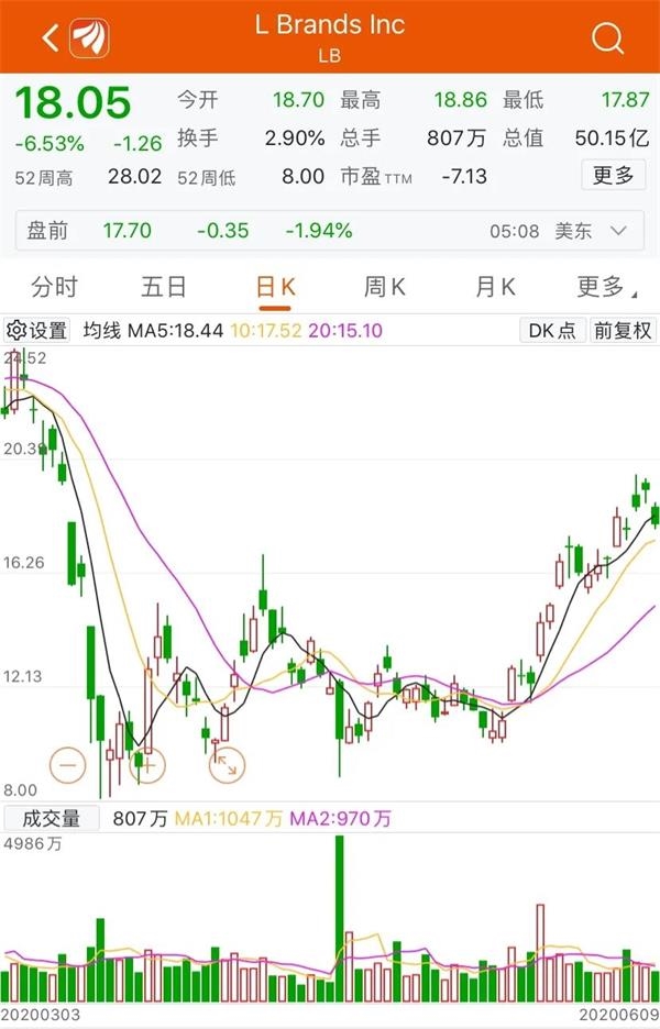 截至6月9日收盘,L Brands股价跌6.53%,报18.05美元,市值为50亿美元。
