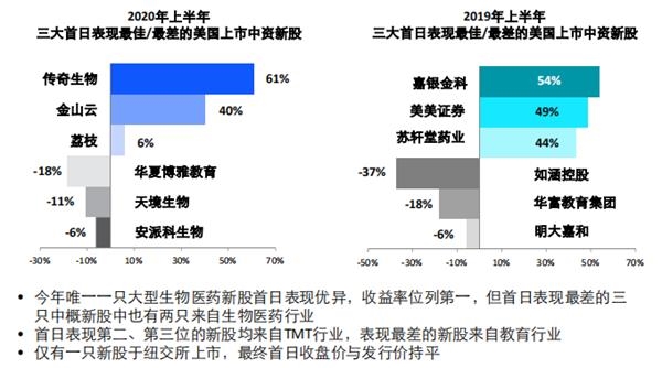 上半年上市的中概股中,医疗及医药行业和TMT行业新股数量并列第一,这些新经济个股首日表现良好。