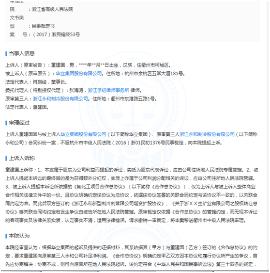 天眼查显示,2017年4月,上诉人童建国因与被上诉人华立集团、原审第三人永和股份合同纠纷一案,不服杭州市中级人民法院作出的民事裁定,向浙江省高级人民法院提起上诉。