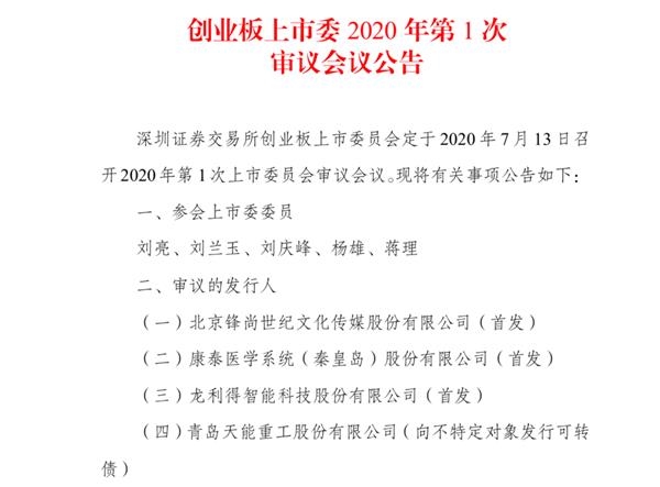 7月13日创业板上市委将迎“第一审”,具体有3单IPO项目(锋尚文化、康泰医学、龙利得),1单可转债项目(天能重工)。