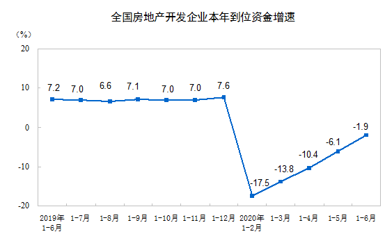 1—6月份,房地产开发企业到位资金83344亿元,同比下降1.9%,降幅比1—5月份收窄4.2个百分点。其中,国内贷款13792亿元,增长3.5%;利用外资46亿元,增长8.0%;自筹资金26943亿元,增长0.8%;定金及预收款26474亿元,下降7.0%;个人按揭贷款13202亿元,增长3.1%。