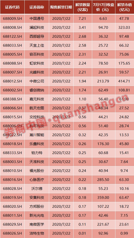 根据数据统计,这批科创板解禁市值按上周五收盘价计算超过1790亿元。其中,解禁市值最大的为中微公司,达414亿元以上,澜起科技、虹软科技、睿创微纳解禁市值皆超100亿。