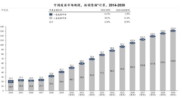 康希诺在其招股书中提到,国内的疫苗市场总规模由2014年的233亿元人民币增至2019年的425亿元人民币,预计到2030年将达到1,320亿元人民币,年均复合增长率为10.9%。其中,需要公民自愿接种且自费购买的二类疫苗增长突出,预计未来将占据中国疫苗市场的绝大多数份额。