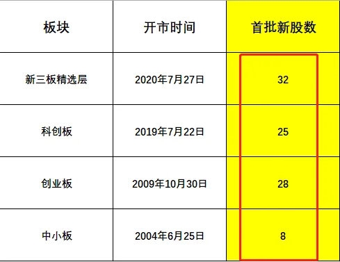 最新的板块开板,有7月27日新三板的精选层的开板,共有32只新股同时挂牌;科创板2019年7月22日开市,25只新股一起登场,挂牌上市。更早的创业板自己开市,则是2009年10月30日,28只新股同台上市,被称为创业板28星宿,C28军团。当然更早的2004年6月25日中小板开市,首批新股为8只。