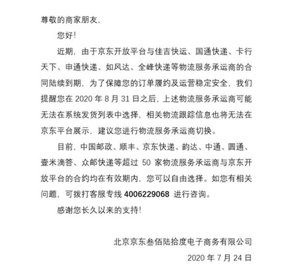 据媒体报道,京东近日通知商家,由于京东开放平台与多家物流服务承运商的合同陆续到期,为了保障订单履约及运营稳定安全,提醒商家在2020年8月31日之后,上述物流服务承运商可能无法在系统发货列表中选择,相关物流跟踪信息也将无法在京东平台展示,建议商家进行物流服务承运商切换。