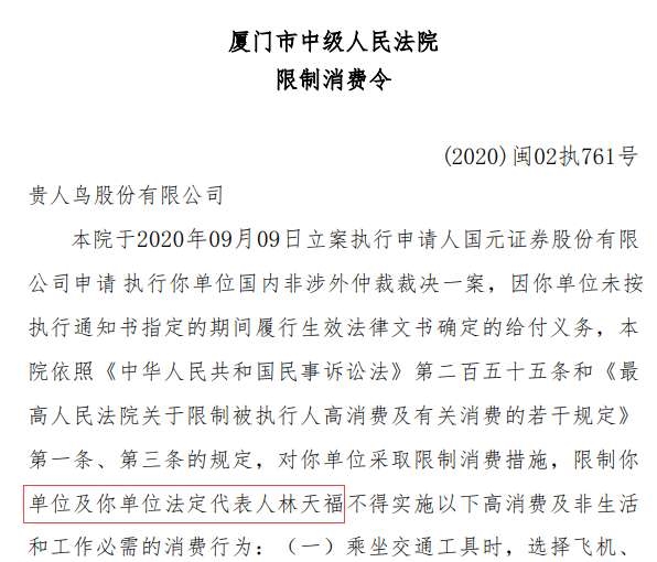 10月22日,厦门市中级人民法院下发限制消费令,被执行人是贵人鸟股份有限公司法定代表人、贵人鸟创始人林天福。