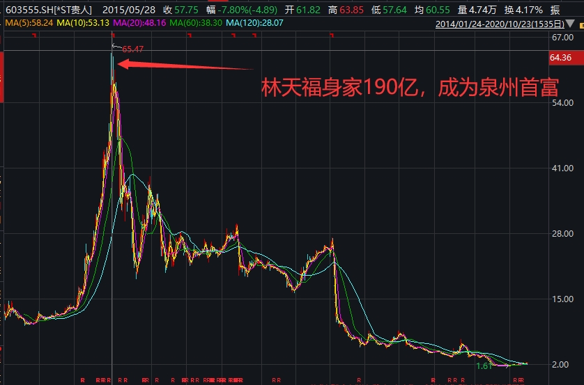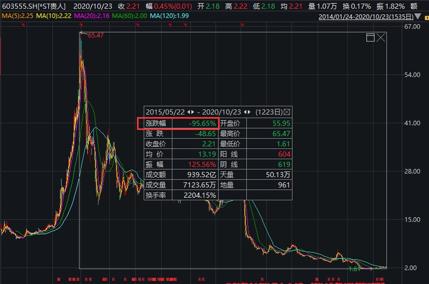 业绩下滑的同时,伴随的是贵人鸟股价的喋喋不休。截至今日,贵人鸟的股价已经从2015年的高位已经下跌了96%,总市值蒸发了386亿。