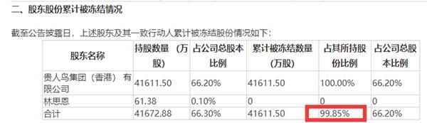 值得一提的是,由于官司缠身,贵人鸟的控股股东及其一致行动人林思恩持有的99.85%的股份已经被法院悉数冻结。