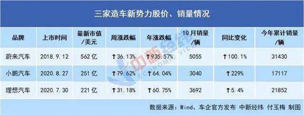 数据显示,今年前10个月,蔚来汽车累计交付量达3.14万辆,同比增长111.4%,理想汽车、小鹏汽车则分别为2.19万辆和1.71万辆。而传统造车势力上汽集团20年前三季度累计销量361.32万辆。两者出货量差距以百倍计。