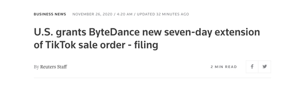 此前,针对8月颁布的行政令,特朗普政府已给予字节跳动15天的延期,直至本周五到期。TikTok方面表示,该行政令的最新期限为12月4日。在美国政府的压力之下,字节跳动为敲定与沃尔玛和甲骨文的交易以将TikTok美国资产转移到新的实体中,已经进行了数月的谈判。美国财政部未在周三立即发表评论。