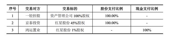根据大豪科技的交易预案,公司拟向一轻控股购买其持有的资产管理公司100%股权,向京泰投资发行股份购买其持有的红星股份45%股份,向鸿运置业支付现金购买其持有的红星股份1%股份。