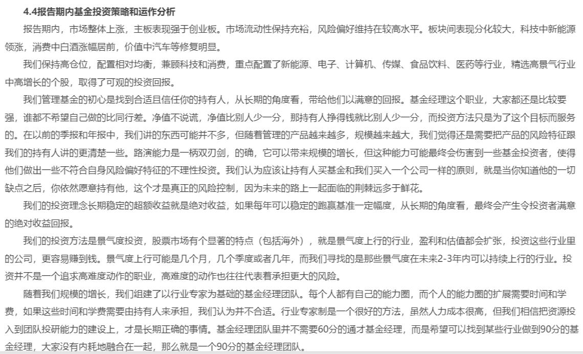 此外,在此次季报中,易方达基金的张坤、景顺长城基金的杨锐文、银华基金的刘辉等人都写得非常用心。当前管理规模高达1200多亿元且长期业绩优异的张坤,在季报中率真地表示:“回顾2020年,在每个时间点市场演绎得都很有逻辑,然而站在当时看未来,却感觉无比模糊。回顾过去,并不是为了能够更好地判断未来的市场走势或者风格,而是再次提醒自己并不具备这个能力。”张坤坦言投资的要义是在纷繁的因素中找到少数重要且自己能把握的因素,利用大数定律,不断积累收益。