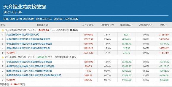 值得注意的是,2月4日与方新侠同时现身天齐锂业龙虎榜买方席位的还有一个机构席位,买入金额为1.24亿元,另外一个上榜的机构席位则是有买有卖,买入金额为1.19亿元,同时卖出0.49亿元。也就是说,面对此时的天齐锂业,机构资金也产生了一定的分歧。