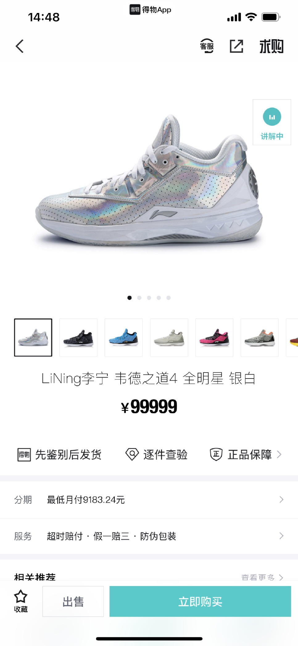 以李宁旗下一款“韦德之道4全明星银白款”为例,得物平台上显示仅有42码,售价为14999元。按照该款球鞋参考发售价1499元计算,涨幅达9倍。有媒体此前报道称,该球鞋价格一度达到48889元,涨幅更是达到31倍。