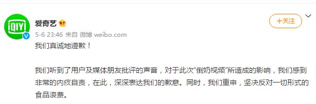 5月6日夜间,爱奇艺发文道歉,称对于“倒奶视频”所造成的影响表达歉意,同时重申坚决反对一切形式的食品浪费。爱奇艺称,从发文即刻起,关闭《青春有你》第三季所有助力通道。