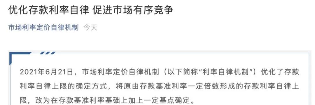 6月21日,市场利率定价自律机制秘书处在其官方微信号上公布了相关消息。发布称,自6月21日起,存款利率自律上限的确定方式,将原由存款基准利率一定倍数形成的存款利率自律上限,改为在存款基准利率基础上加上一定基点确定。