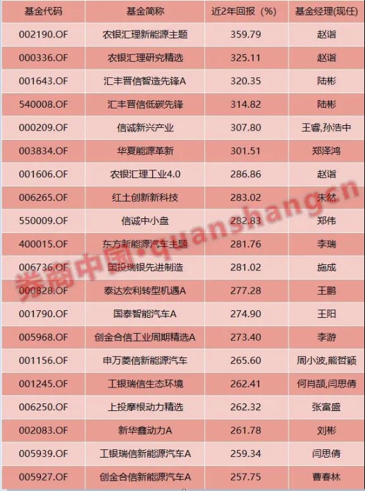截至2021年7月16日,近两年业绩回报在300%以上的均是投资新能源方向的基金。其中,赵诣管理的农银汇理新能源主题、农银汇理研究精选回报率分别达359.79%、325.11%,分列冠亚军,陆彬管理的汇丰晋信智造先锋A、汇丰晋信低碳先锋以320.35%、314.82%的收益率分列三、四名。另外,王睿、孙浩中共同管理的信诚新兴产业和郑泽鸿管理的华夏能源革新近2年收益率也超过300%。