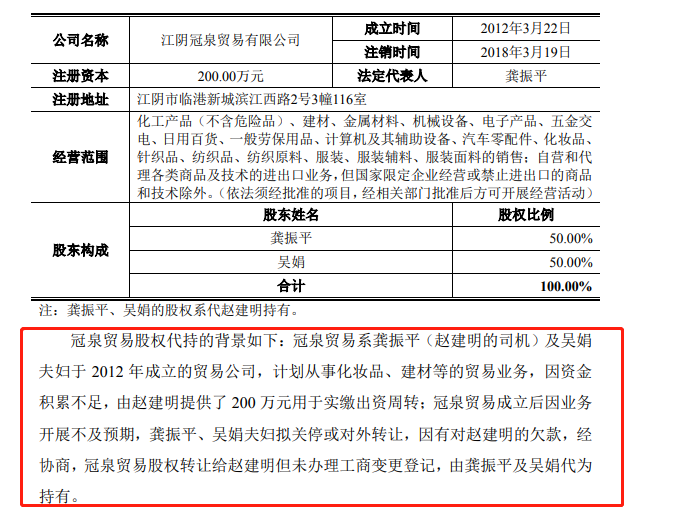 招股书又称,冠泉贸易计划从事化妆品,建材等贸易,成立后业务开展不及预期,龚振平、吴娟夫妇拟关停或对外转让,因有对赵建明的欠款,经协商,冠泉贸易股权转让给赵建明但未办理工商变更,由龚振平及吴娟代持。