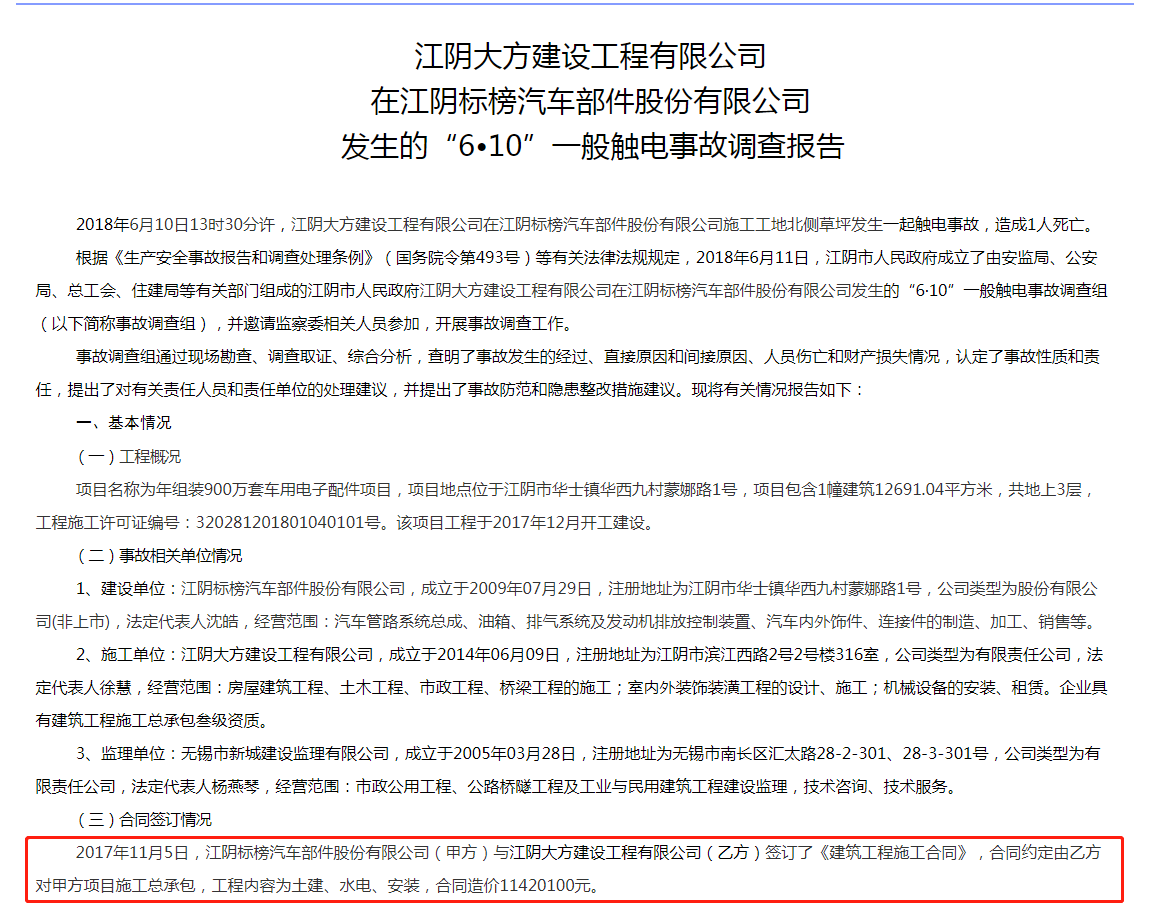 公开资料则显示,2018年6月10日13时30分许,江阴大方建设工程有限公司在江阴标榜汽车部件股份有限公司施工工地北侧草坪发生一起触电事故,造成1人死亡。该事故调查报告显示,2017年11月5日,江阴标榜汽车部件股份有限公司(甲方)与江阴大方建设工程有限公司(乙方)签订了《建筑工程施工合同》,合同约定由乙方对甲方项目施工总承包,工程内容为土建、水电、安装,合同造价1142万元。