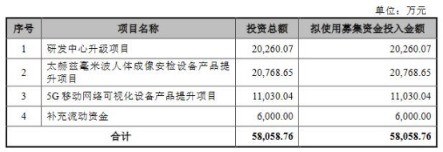 载德科技原拟公开发行股票数量不超过1500万股,占发行后总股本的比例不低于25%。公司原拟募集资金5.81亿元,分别用于研发中心升级项目、太赫兹毫米波人体成像安检设备产品提升项目、5G移动网络可视化设备产品提升项目、补充流动资金。