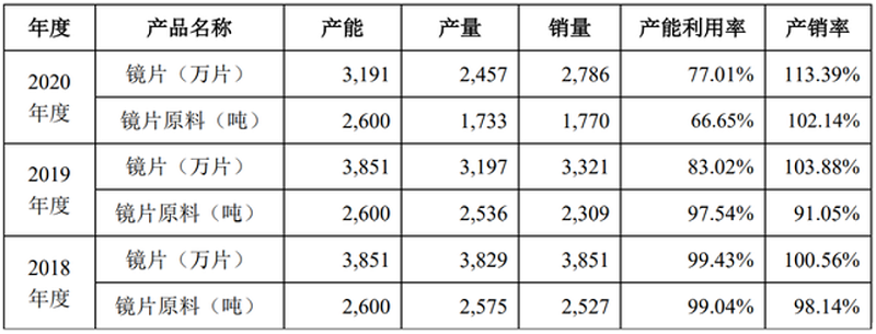 2018年,明月镜片生产的镜片和镜片原料的产能利用率分别为99.43%、99.04%;2019年的数据分别为83.02%、97.54%;2020年的数据分别为77.01%、66.65%。很明显,报告期内,明月镜片产能利用率持续下滑。