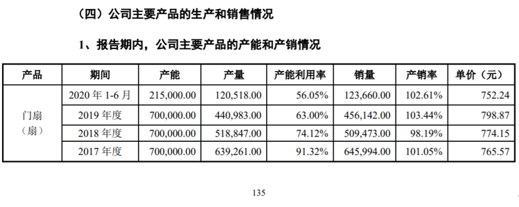 事实上,木门类产品是梦天家居的主要产品类型,销售比重超过三分之二,但是招股书也披露该产品的产量和销量在2017年之后持续下滑,2020年上半年在庆元厂区搬迁受阻、嘉善厂区部分生产线进行技改提升导致公司木门产能下降的背景下,产能利用率依然顽强地创下新低,有超过4成的产能处于闲置状态,并未能体现出招股书中所描述的品牌优势、行业地位优势、终端销售渠道优势。