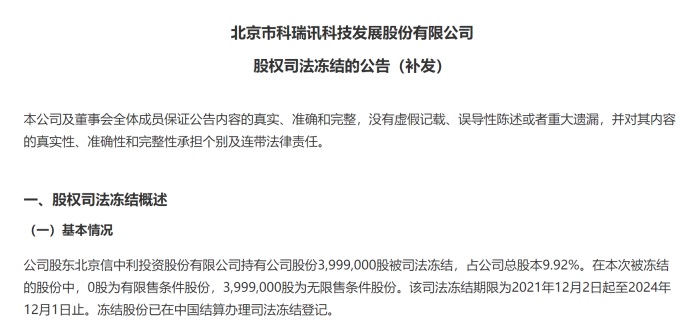 科瑞讯也在12月18日发布股权司法冻结公告,信中利持有该公司的399.9万股被司法冻结,司法冻结期限为2021年12月2日起至2024年12月1日止。
