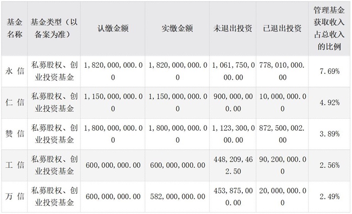 信中利10月发布的2021年半年度财报中显示,对其报告期内收入贡献最大的五支基金分别为永信、仁信、赞信、工信和万信基金。