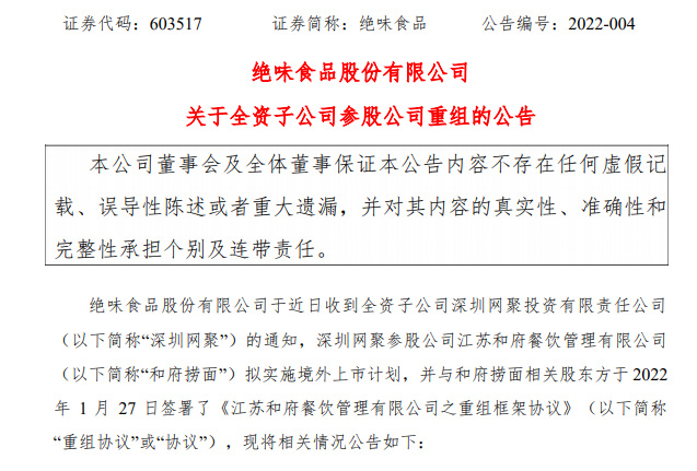 绝味食品1月28日晚间公告,其全资子公司深圳网聚的参股公司江苏和府餐饮管理有限公司 (以下简称“和府捞面”)拟实施境外上市计划,拓展更多融资渠道推动业务发展。