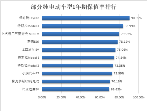 据中国国际贸易促进委员会汽车行业分会汽车金融暨保值率研究委员会发布的《2022·Q1中国汽车保值率排行榜》数据,相比于2021年三季度的一年期保值率,很多热门纯电车型在2022年一季度的保值率有了不同程度提高。以特斯拉Model 3、蔚来ES6、小鹏P7、比亚迪汉EV和宏光MINI EV这五款热销车型为例,其今年一季度的一年保值率较去年三季度分别上升了11.23%、3.3%、7.35%、4.02%和4.84%。