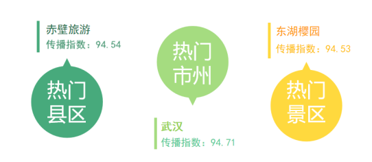 在市州维度,本期武汉传播指数为94.71,咸宁94.57,宜昌94.54,分别位居前三。经梳理发现,武汉的微信、微博、短视频平台的提及数远超其他市州,但受部分负面报道影响,导致与第二第三名传播指数相差不大,未能拉开明显距离。就全网传播情况进行分析,3月武汉传播指数受到多方面因素助推。政策方面,国务院批复同意《长江中游城市群发展“十四五”实施方案》,媒体将其解读为湖南湖北江西迎来国家重大政策红利。其中提到支持三省旅游业联动发展,共建旅游线路。打造红色武汉、革命大别山、秋收起义·湘赣红旗等红色旅游线路,推进韶山一井冈山等红色旅游专线综合开发;打造武汉一长沙一南昌周末游产品。在生态旅游方面,武汉江夏区灵山废弃矿区打造成4A级景区,经过两年多的综合治理,完成华丽转身,成为独具特色的矿山遗址公园和新晋网红打卡地,为生态修复旅游趟出一条新思路。相关新闻获新华网、中国环境报、中国新闻网、工人日报、人民周刊网、半月谈等主流媒体转载报道,可见,好的旅游创新做法无疑是地方旅游形象传播的一大推手。此外,景区方面也因春天到来焕然一新,获网民关注。