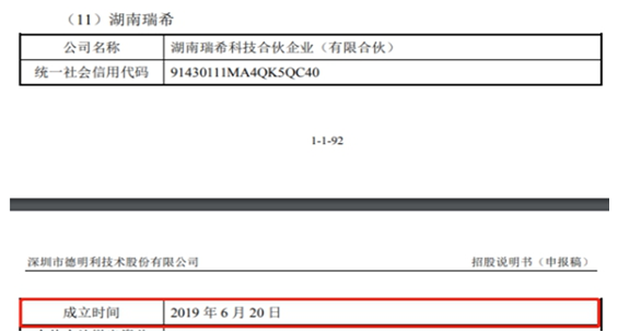 此外,德明利历史上经历了多次增资扩股。2019年6月10日德名利有限通过董事会决议,同意将公司注册资本增加至2209.9013万元,其中,湖南鼎鸿以2200万元认缴新注册资本22.6805万元,湖南瑞希以1500万元认缴新增注册资本15.4639万元。然而公开资料显示,湖南鼎鸿成立日期是2019年6月14日,而湖南瑞希成立日期是2019年6月20日,均晚于公司董事会决议通过上述两家公司增资的时点。