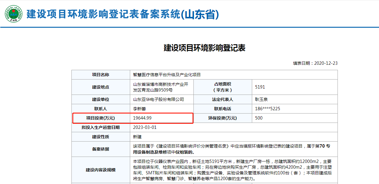 亚华电子招股书披露,公司此次上市募投的另一项目是投资,7,867.29万元用于研发中心建设。而在中华人民共和国生态环境部网站上,记者还发现,2020年10月,亚华电子对“智慧病房服务交互系统科研创新平台”项目进行环评备案。信息显示,上述项目总投资高达10930万元,项目位于淄博高新区仪器仪表产业园,占地约10亩,建设1栋第三方检测中心大楼,建筑面积约7000平。亚华电子称,项目建成后实现以“智慧病房服务交互系统”为主体框架,完成“智慧病房交互”、“智慧护理”、“远程会诊探视”、“智慧物联网”,实现医护患立体交互、医护业务流程智能化再造、护理品质管理、医护内外网远程交互、病区人员与物资管理、病区安全管理等。该项目2021年12月8日拟投入生产运营。