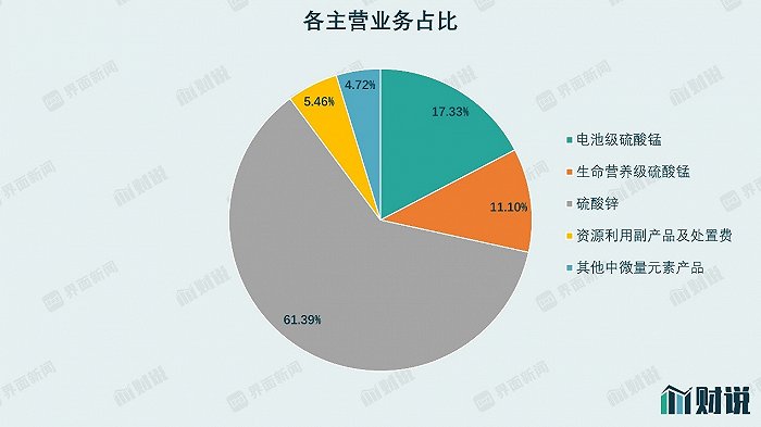 埃索凯在招股书中宣称其主要从事新能源电池级硫酸锰、生命营养级硫酸锰及硫酸锌等产品的研发、生产和销售。实际上,电池级硫酸锰为埃索凯第二大业务,占比不高。公司真正的主营业务是硫酸锌。