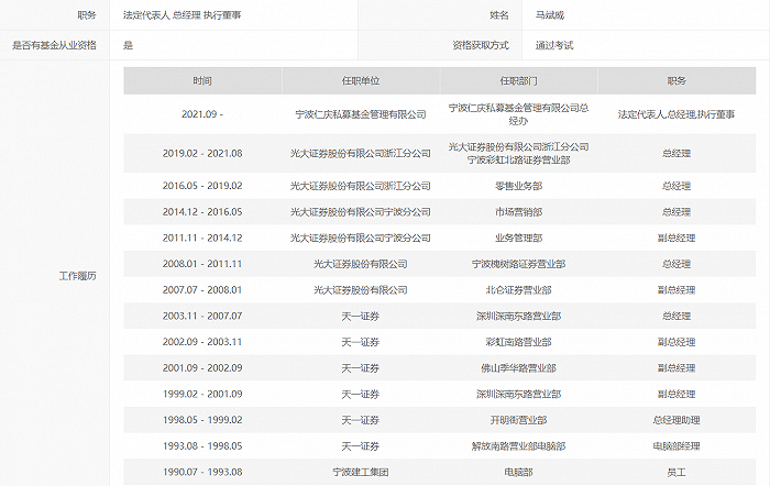图片:宁波仁庆私募实控人马斌威履历情况;图片来源:中国基金业协会