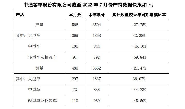 8月4日,中通客车披露的月度产销数据显示,公司7月分销量480辆,本年累计销量3662辆,同比下滑21.47%。