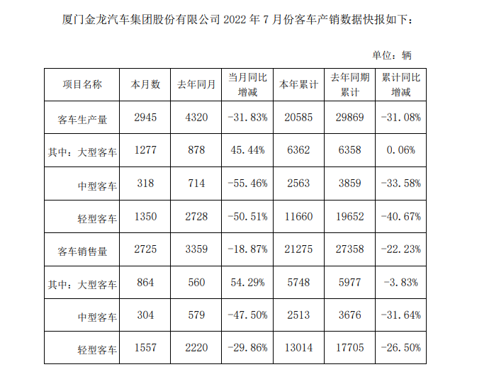 另外一家A股客车企业金龙汽车(SH600686,股价6.93元,市值49.7亿元),在8月4日晚间披露了其7月份产销数据。具体来看,该公司7月客车产量为2945辆,本年累计产量为20585辆,同比减少31.08%;7月客车销售量为2725辆,本年累计销售量为21275辆,同比减少22.23%。