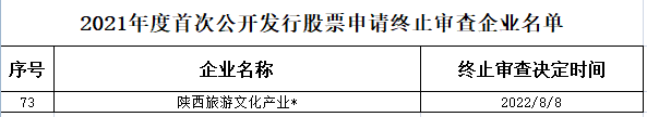 中国经济网北京8月15日讯证监会网站上周五披露信息显示,陕西旅游文化产业股份有限公司(以下简称“陕西旅游”)首次公开发行股票申请被终止审查。
