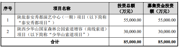 陕西旅游原拟在上交所主板公开发行1933.3334万股,占发行后总股本的25%,拟募集资金85,000.00万元,分别用于“陕旅泰安秀都演艺中心(一期)项目(以下简称”泰安秀都项目“)”、“陕西少华山国家森林公园索道增容(南线索道)项目(以下简称”少华山索道项目“)”。