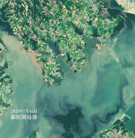 2021年7月14日和2022年8月8日拍摄的鄱阳湖梅树岭附近的卫星影像。